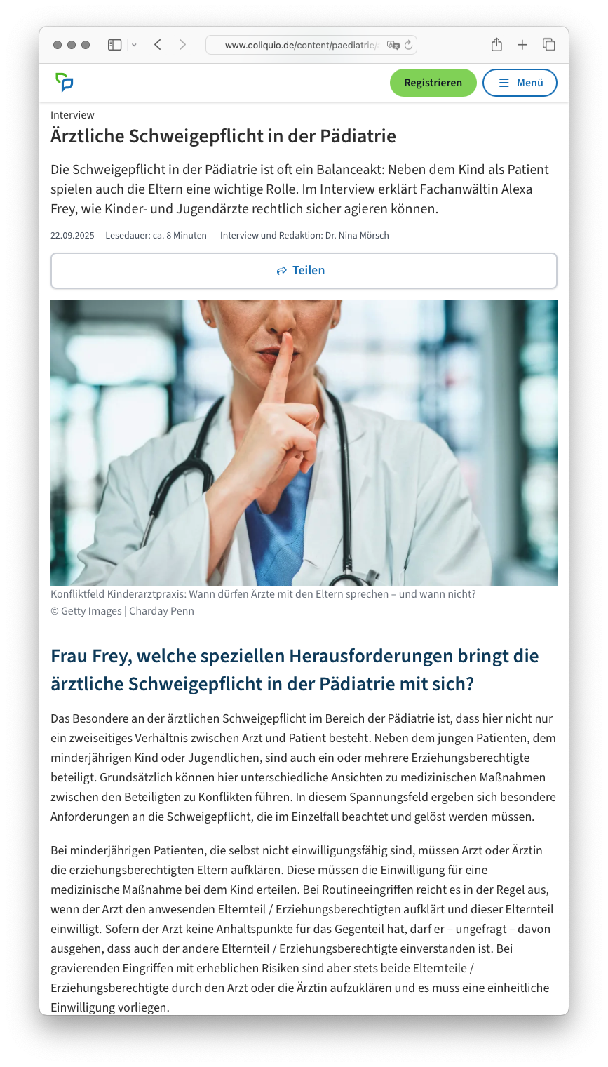Die Schweigepflicht in der Pädiatrie ist oft ein Balanceakt: Neben dem Kind als Patient spielen auch die Eltern eine wichtige Rolle. Im Interview erklärt Fachanwältin Alexa Frey, wie Kinder- und Jugendärzte rechtlich sicher agieren können.